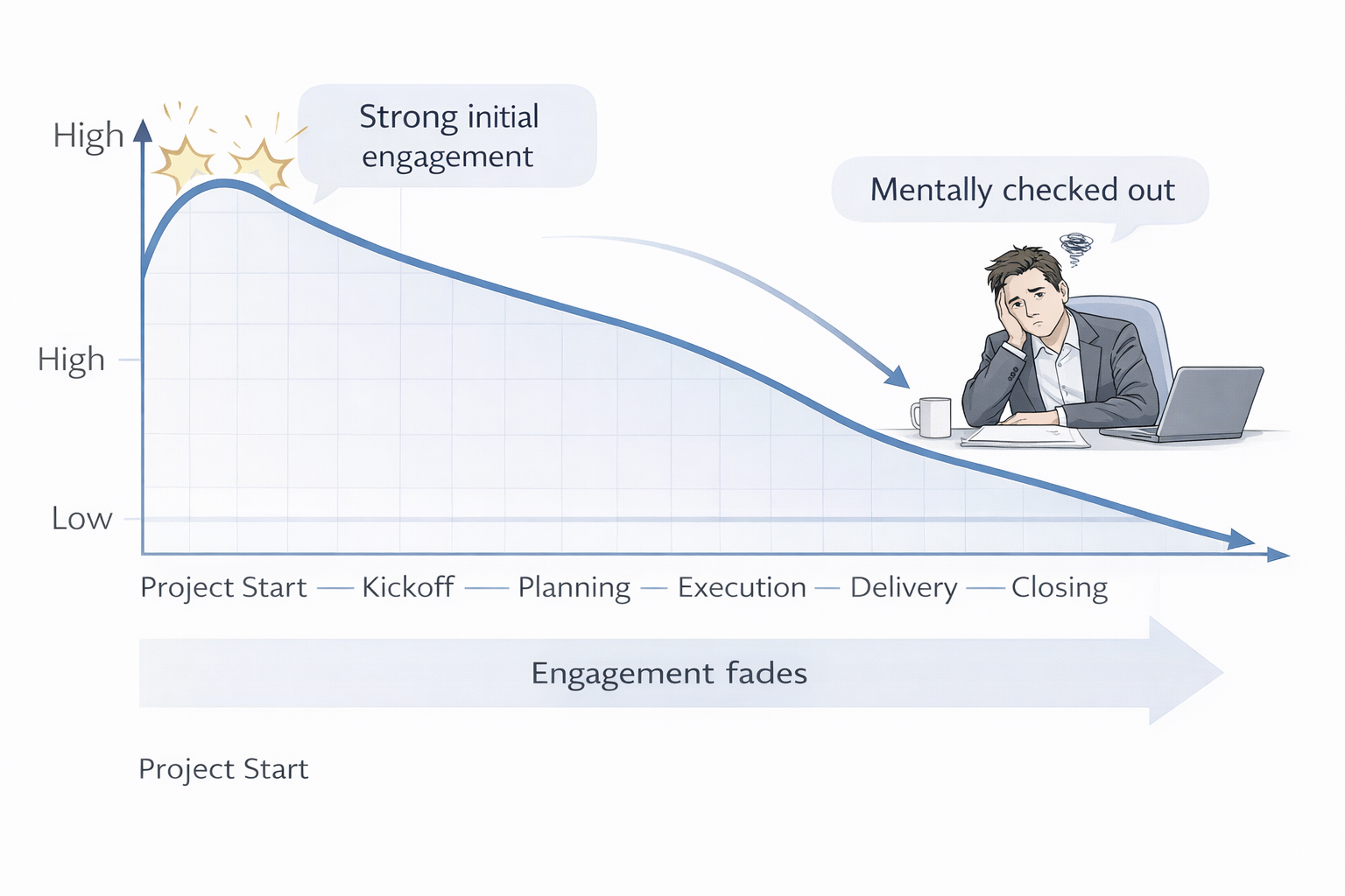 The early warning signs are consistent across programs and organisations. Steering committee meeting attendance starts to drop. Sponsors stop asking questions in reviews and start delegating attendance to their deputies. Business unit leads who were active in early working groups become harder to schedule. Decisions that used to take a week start taking three weeks because nobody is quite sure who should make them.
